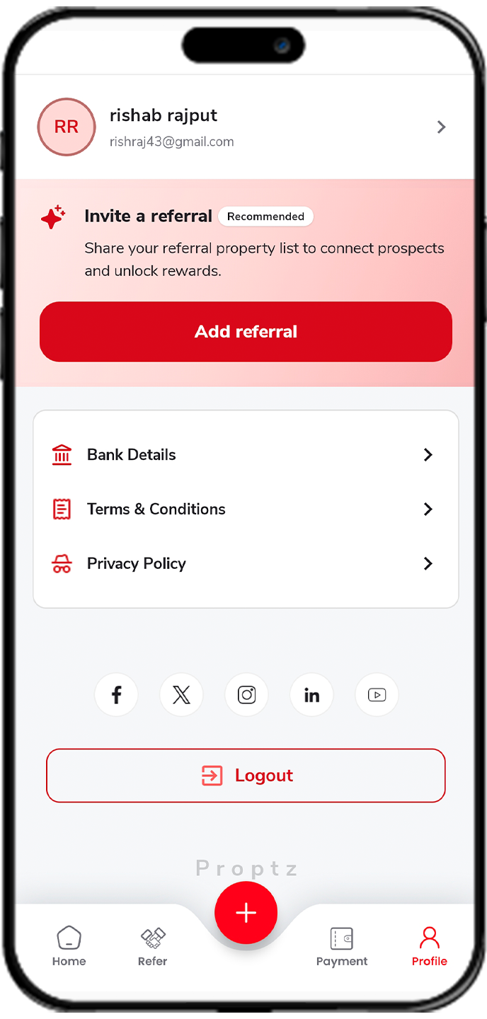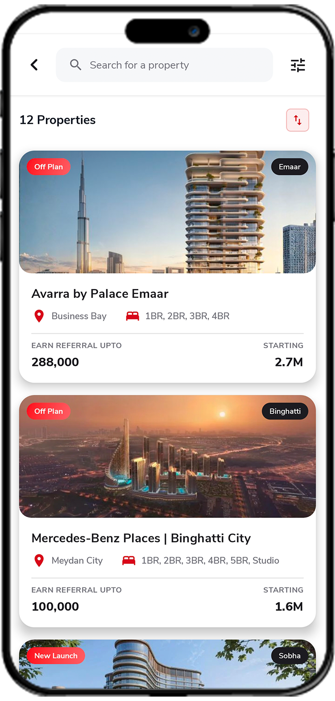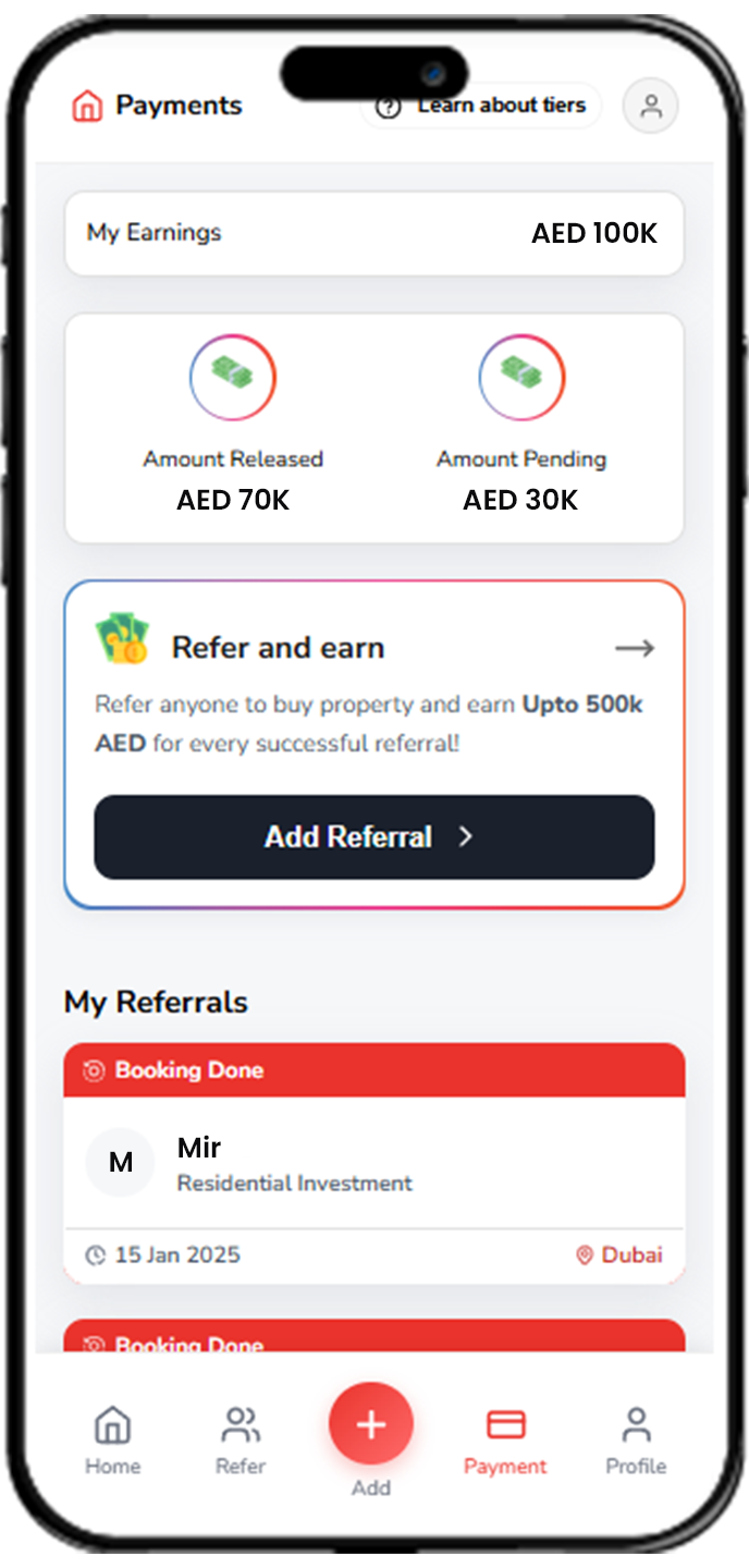 Our app is designed to make earning from real estate effortless whether you’re referring clients, exploring Dubai’s top projects, or tracking your payment in real time.